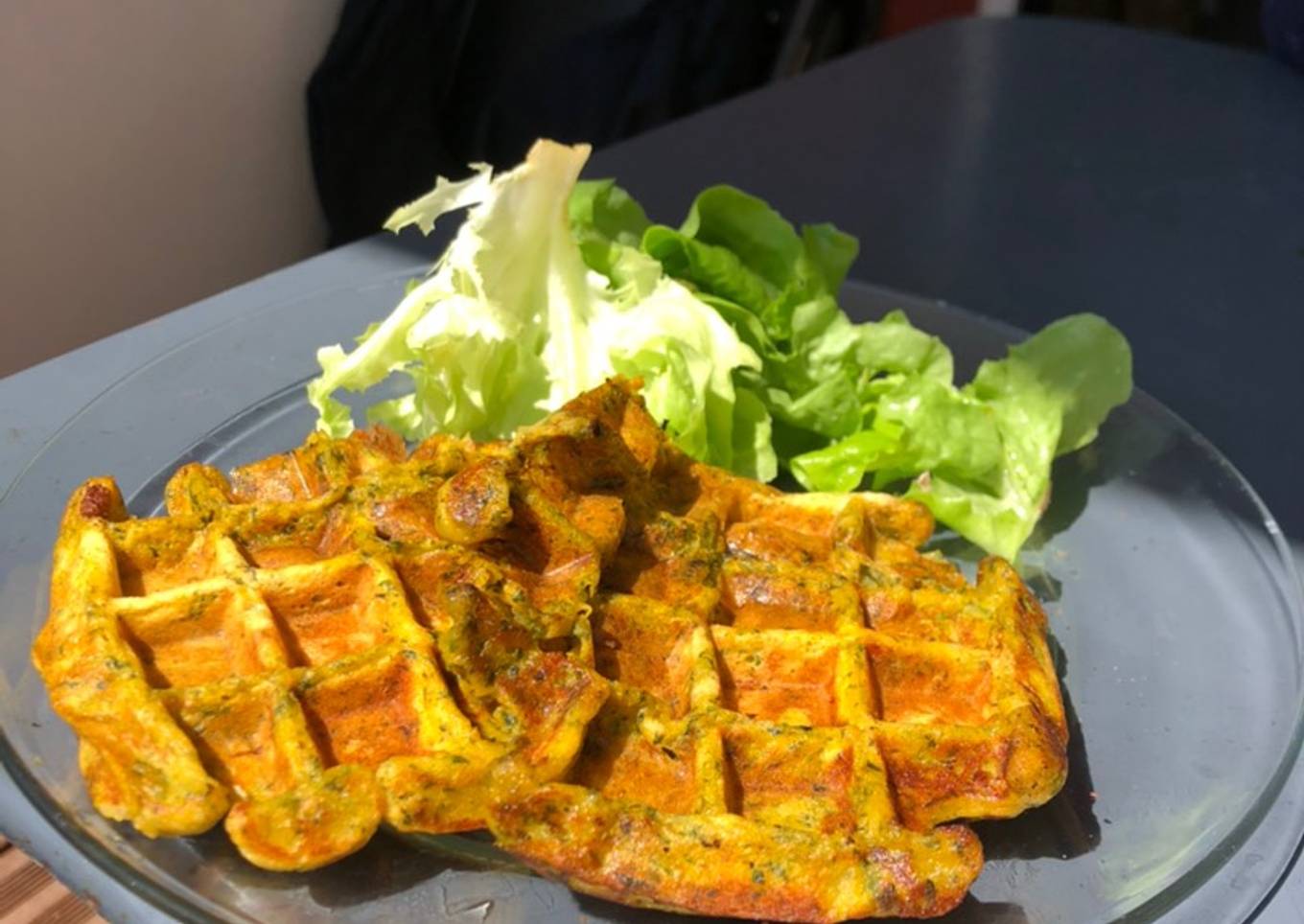 - Graisser le gaufrier avec l'huile d'olive, et les faire cuire durant 3 à 4 min. Les garnir selon vos envies! Pour moi c'était gaufre salade verte 😉