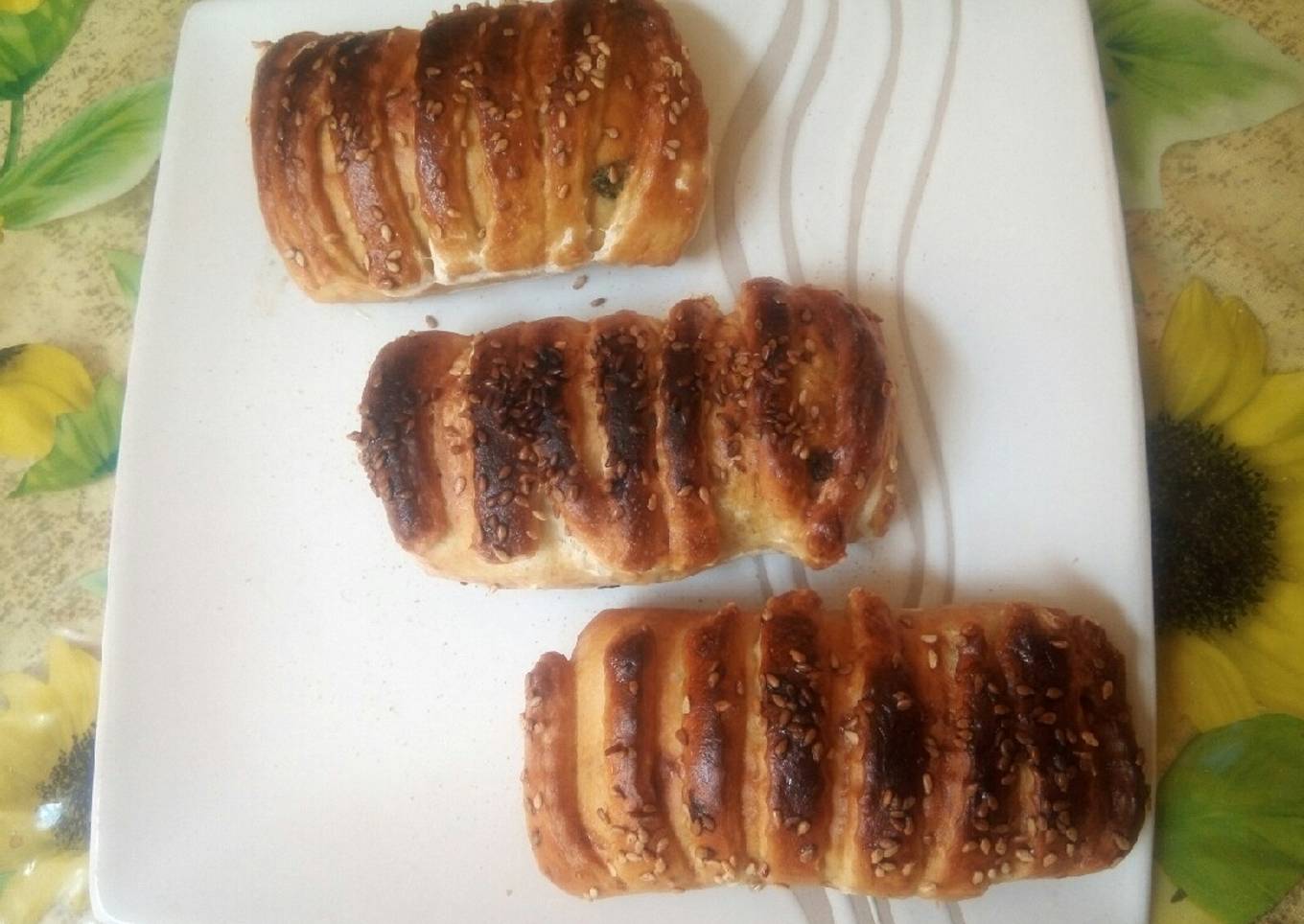 - Étaler la pâte sous forme de rectangle, couper les rubans de l'autre côté. Installer la farce au milieu, mettez le blanc d'œuf sur les côtés. Plier deux fois, ajouter le mélange d'œuf et les graines de sésames. Enfourner à 220 degré pendant 30 à 40 minutes.