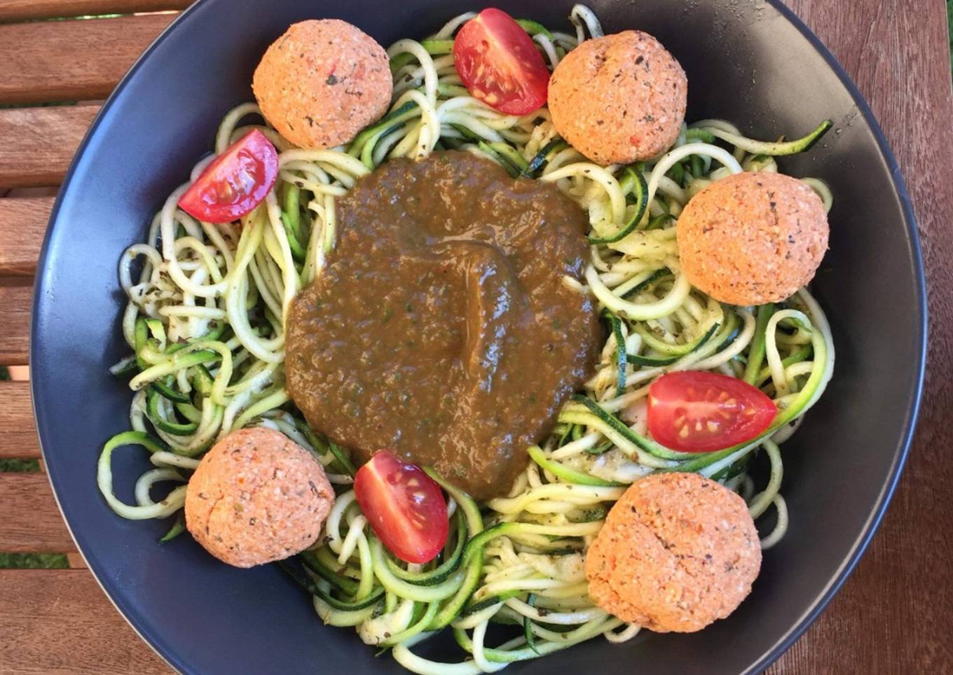 Spaghetti de courgettes crues, sauce napolitaine crue et boulette de tofu rosso