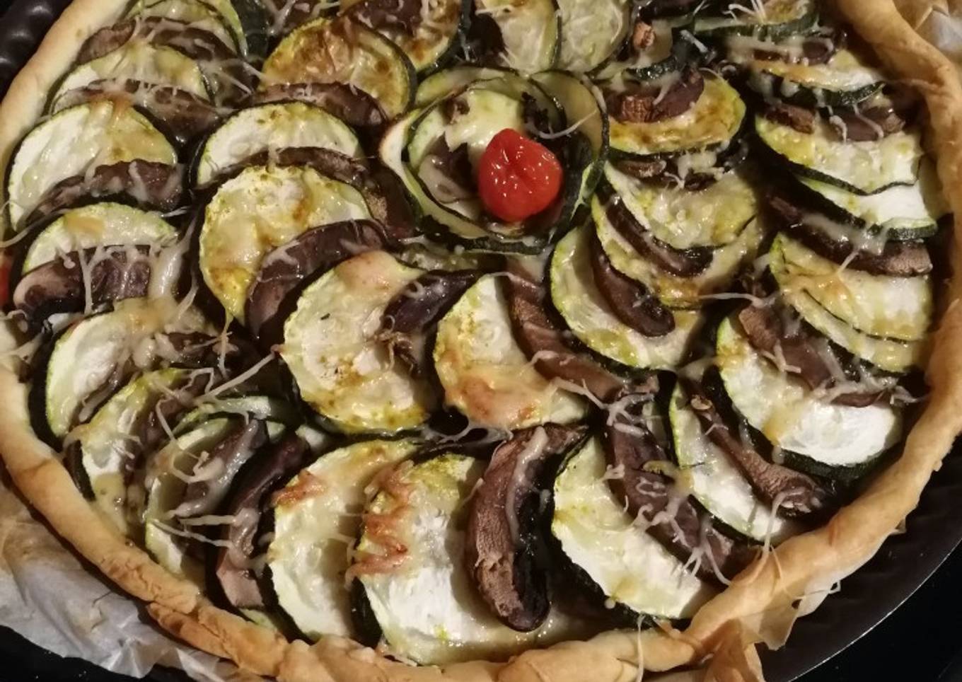 - Disposer les tranches de courgettes et champignons à votre guise sur le dessus de la tarte