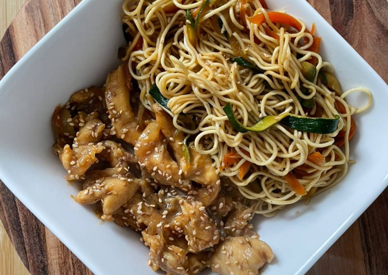 ☑️ Dressez dans un plat avec nouilles d’un côté et poulet de l’autre en ajoutant des graines de sésames sur le poulet