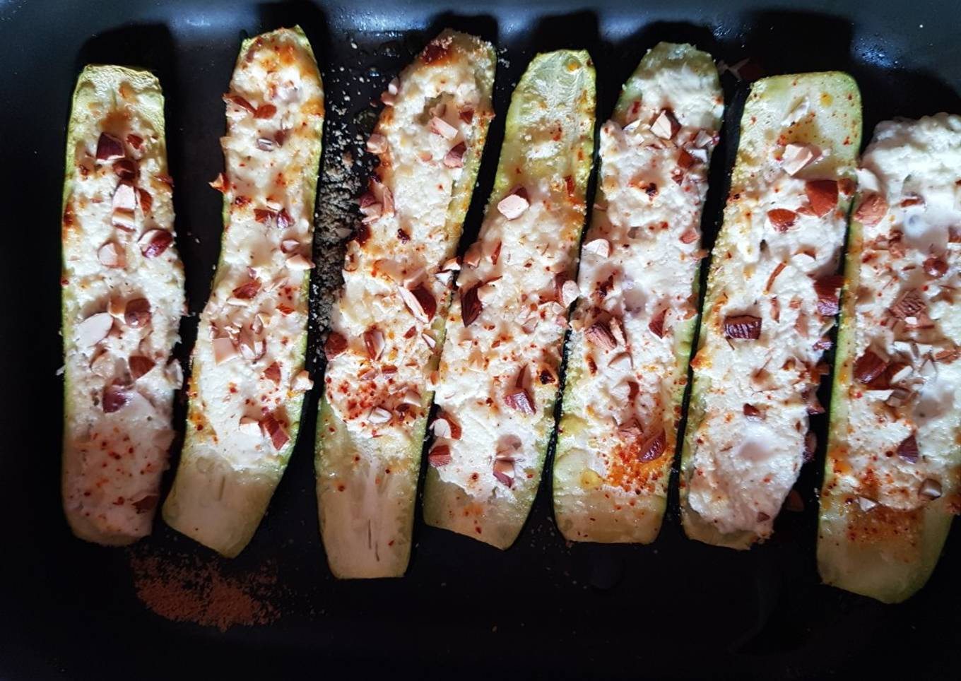 - Creuser les courgettes, mettre de la poudre d'amandes au fond, saler et poivrer la faisselle de chèvre. Mettre ce mélange dans les courgettes. J'ai concassé des amandes que j'ai disposé dessus. Arroser le tout avec un peu d'huile d'olive et de piment d'espelette. Mis au four préchauffé 180° pendant 30 mn.