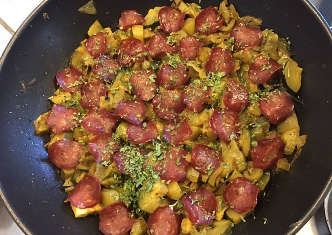 Mijoté de puntarelle fenouil courgettes aux épices et chips de porc