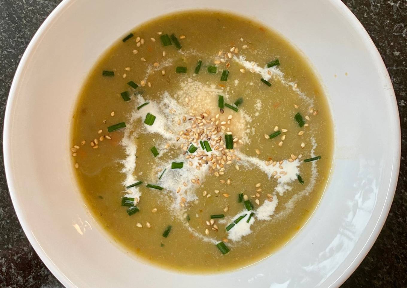 - Servir avec 1 cas de crème, un peu de parmesan et quelques graines. (Ici sésame grillé)