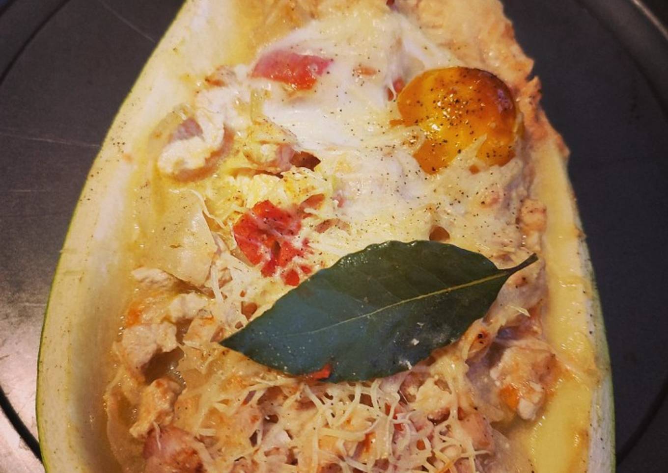 - Et ensuite je mets toute ma préparation dans ma courgette coupée en deux je mets le gruyère par-dessus et l'oeuf si vous en avez envie