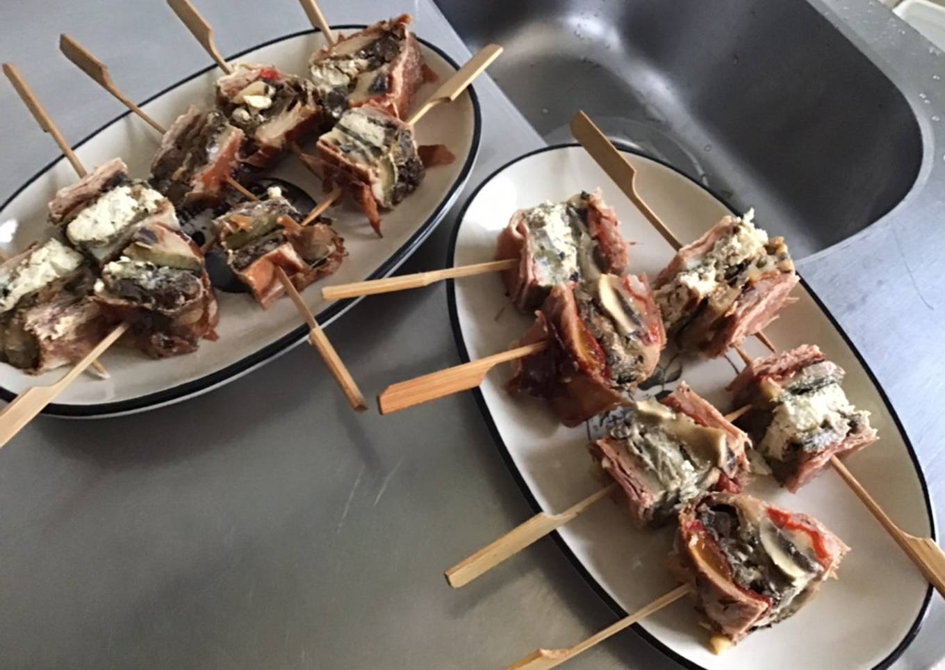 Mini brochettes au bacon courgettes aubergines poivrons provolone et prosecco
